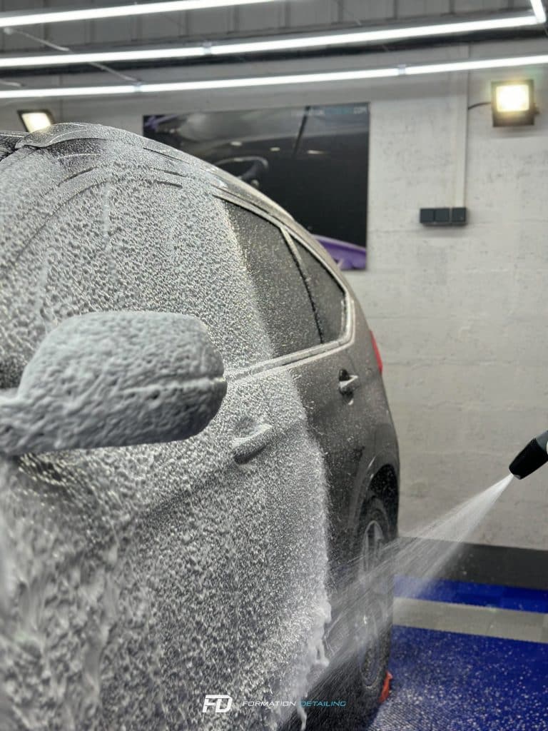 Le prélavage encapsule ces particules de saleté avec la mousse ou la solution détergente, les soulève de la surface de la peinture, et les fait glisser au moment du rinçage. Cela signifie que lors du lavage manuel, il y a moins de contaminants en surface, donc moins de risques d’endommager la peinture avec le frottement des accessoires de lavage.